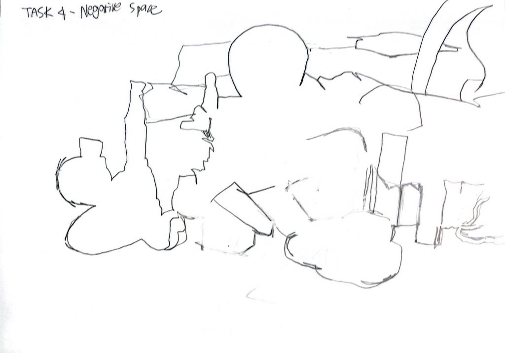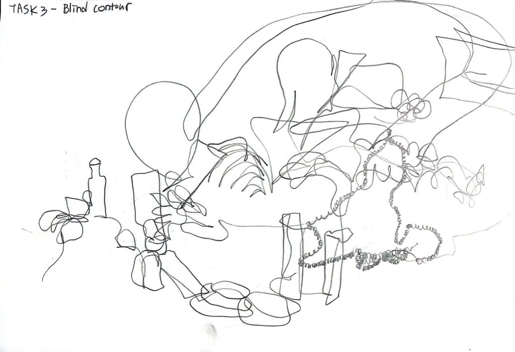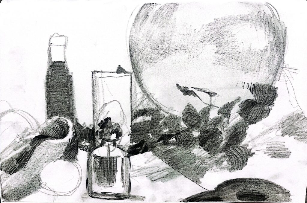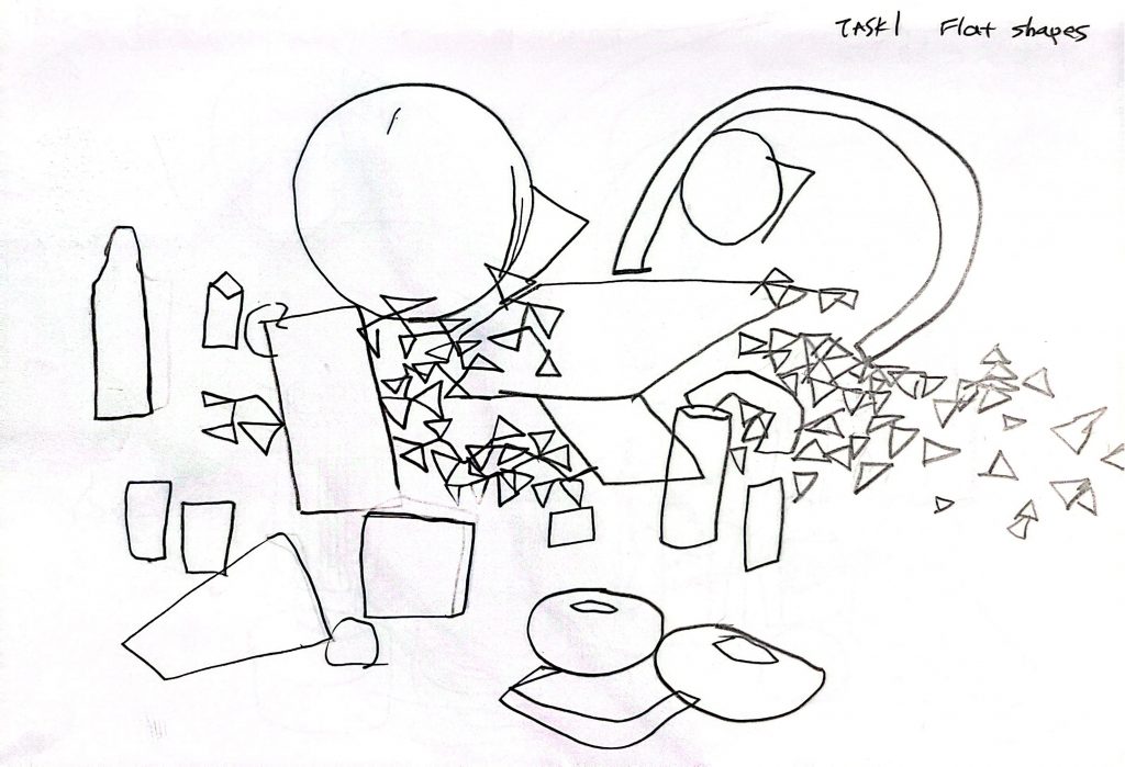 During class, we gathered various still-life objects that my classmates brought and went through several stages of drawing them. I tried drawing using only flat basic shapes, then only solid 3D forms, did a blind contour drawing with my eyes closed, drew the silhouettes of the surrounding spaces instead of the objects themselves, and used patterns to depict textures. Finally, we created three different compositions and chose one to complete as a detailed drawing.